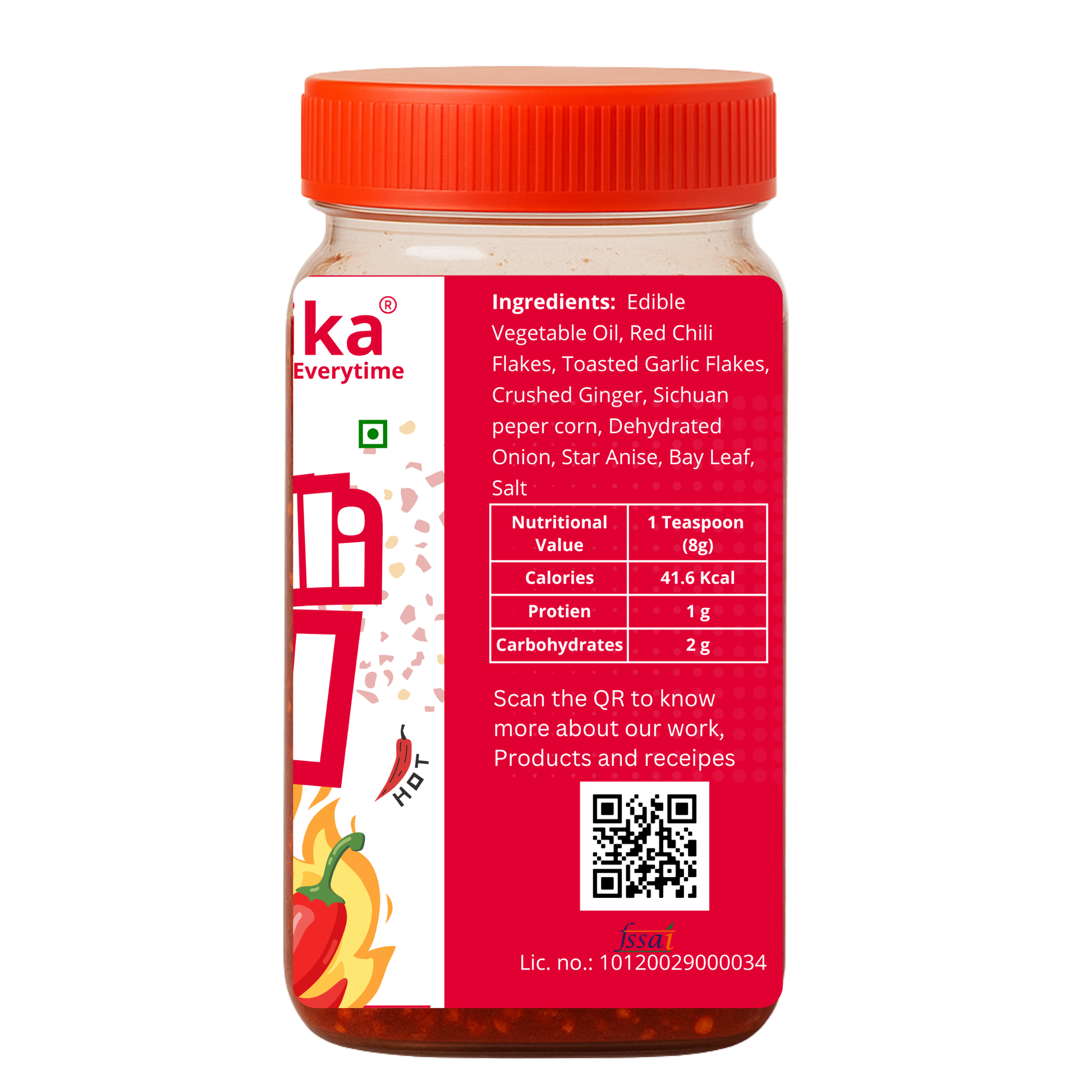 Spice up your meals with Octorikaβs signature Red Chilli Oil β a bold fusion of Sichuan heat and Indian flavor. Crafted with a rich blend of Kashmiri & Guntur chilli flakes, crispy garlic, ginger, sesame seeds, and aromatic whole spices, this chunky chilli oil adds an instant kick to momos, noodles, fried rice, or even your daily dal-chawal.