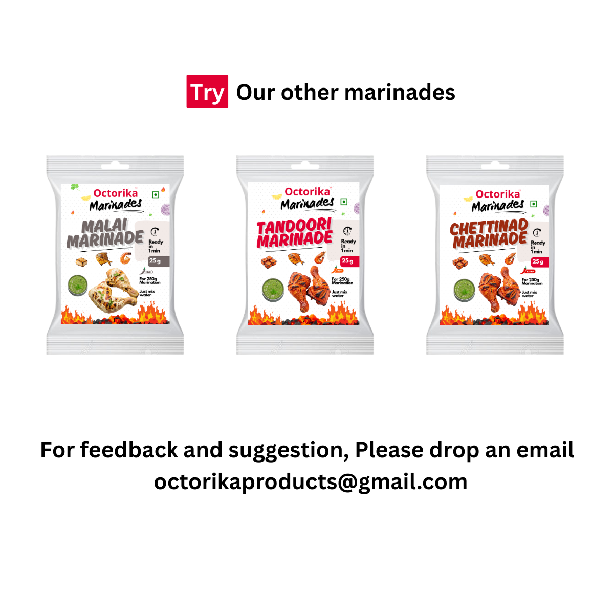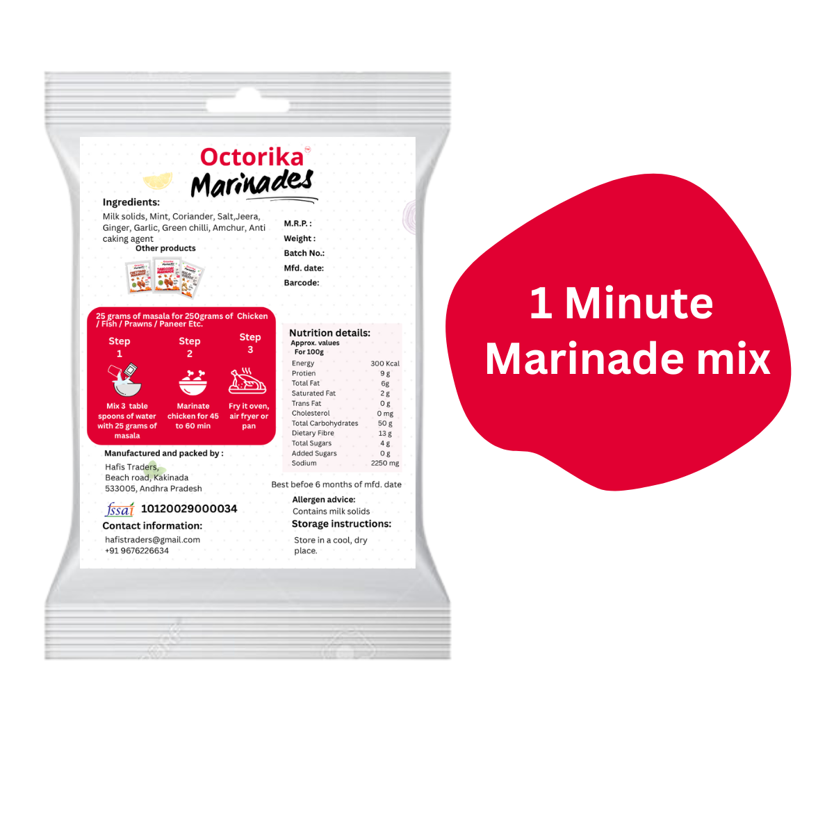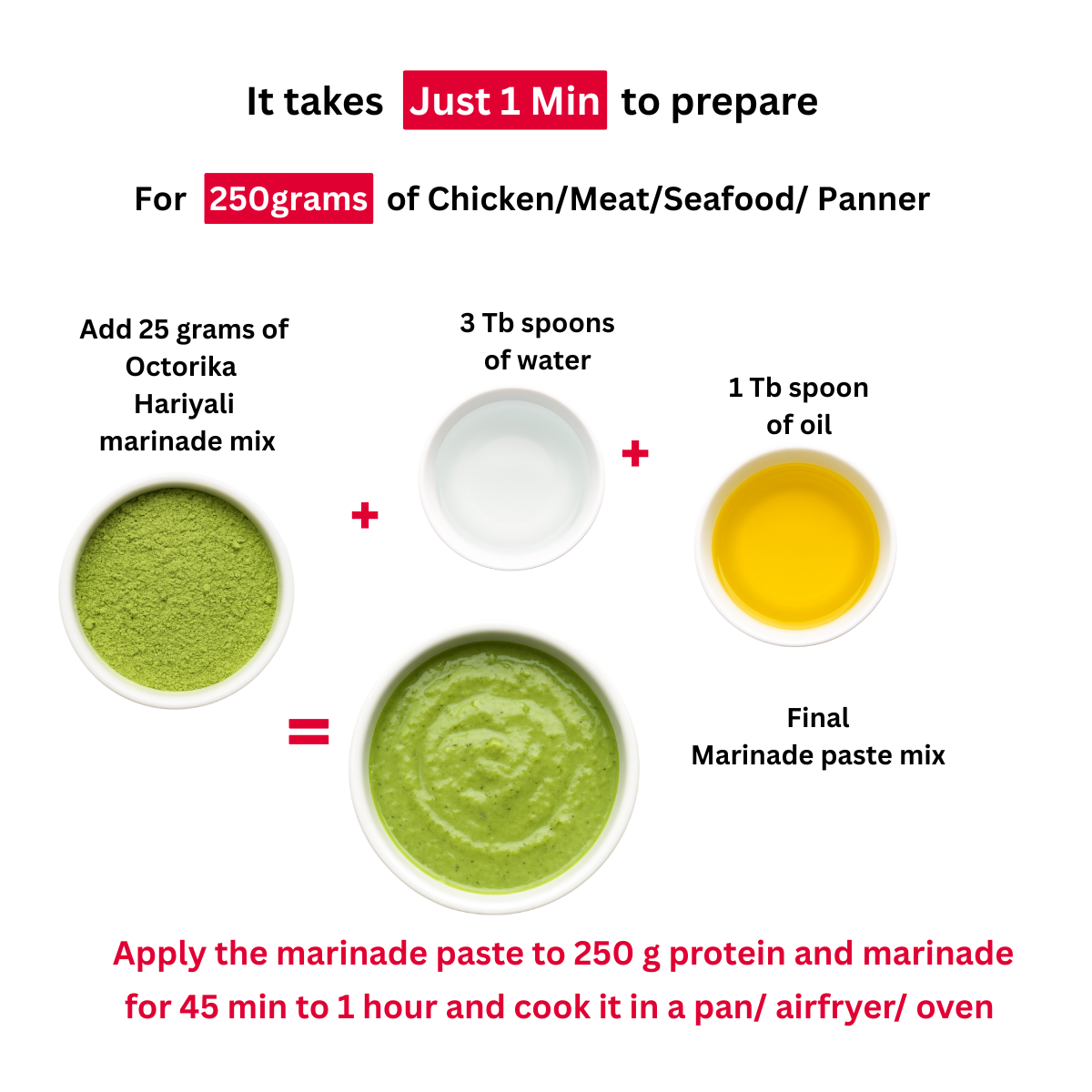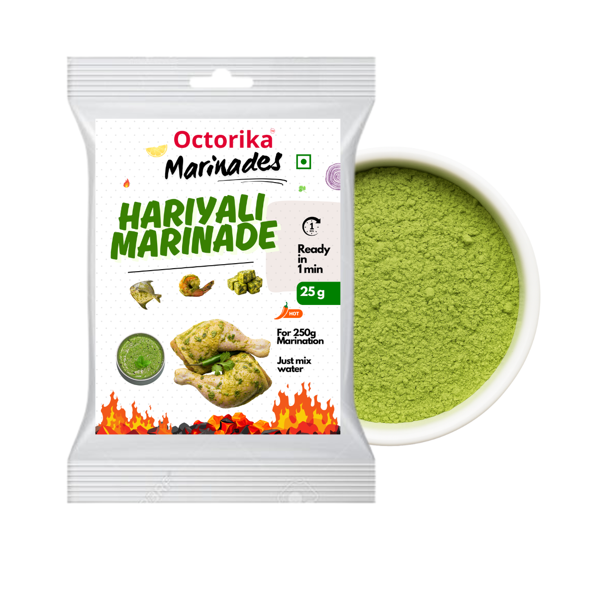 Bring home the fresh, zesty flavours of North Indian grills with Octorikaβs Hariyali Marinade Mix. Packed with mint, coriander, and signature spices, this vibrant green marinade transforms your meats and paneer into juicy, herb-infused delights.