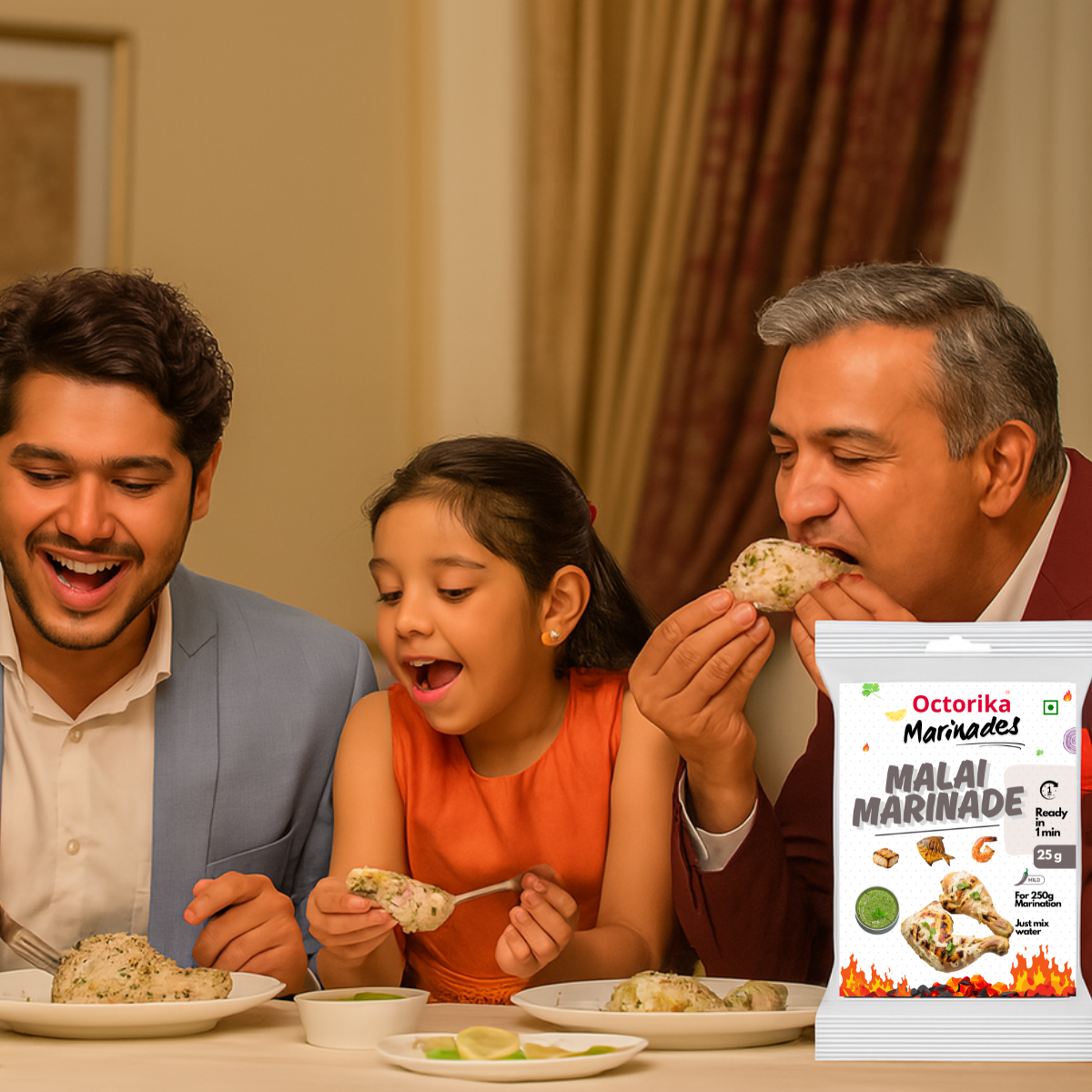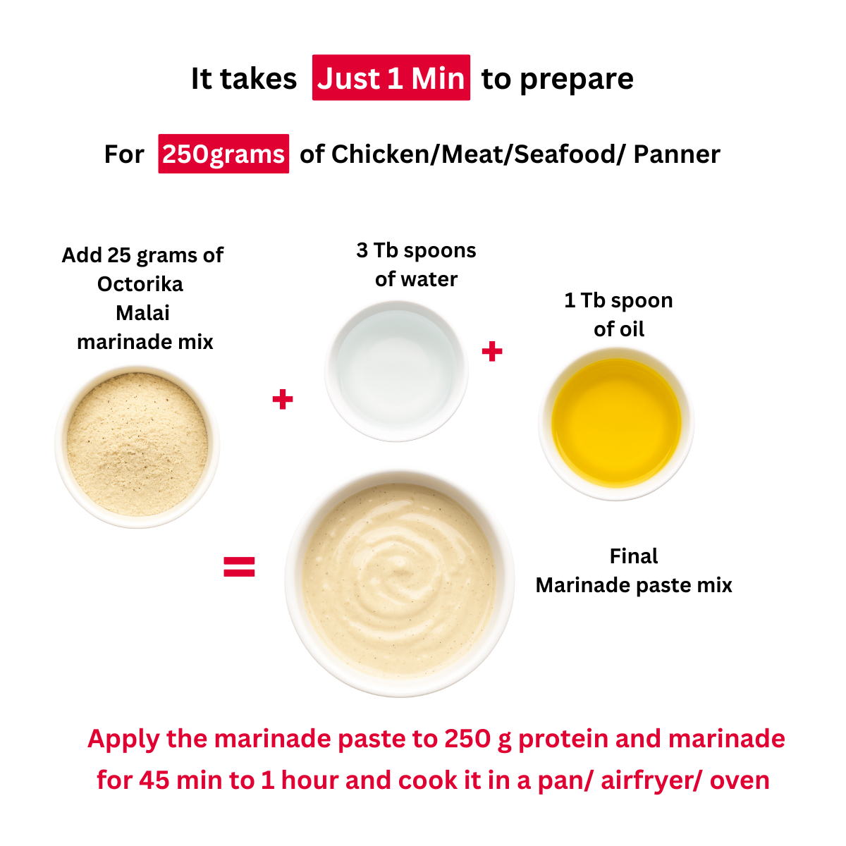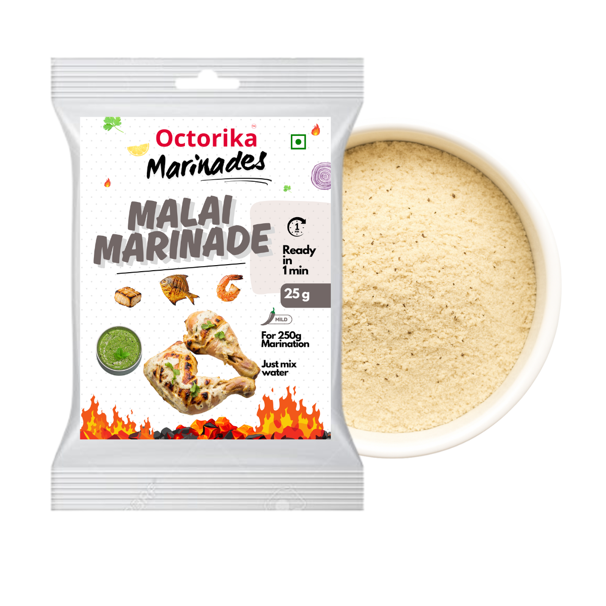 Enjoy the rich, velvety taste of restaurant-style malai tikka at home with Octorika’s Malai Marinade Mix. Made with a delicate blend of dairy solids, mild spices, and herbs, this marinade brings out a creamy, aromatic flavor that's perfect for the whole family.